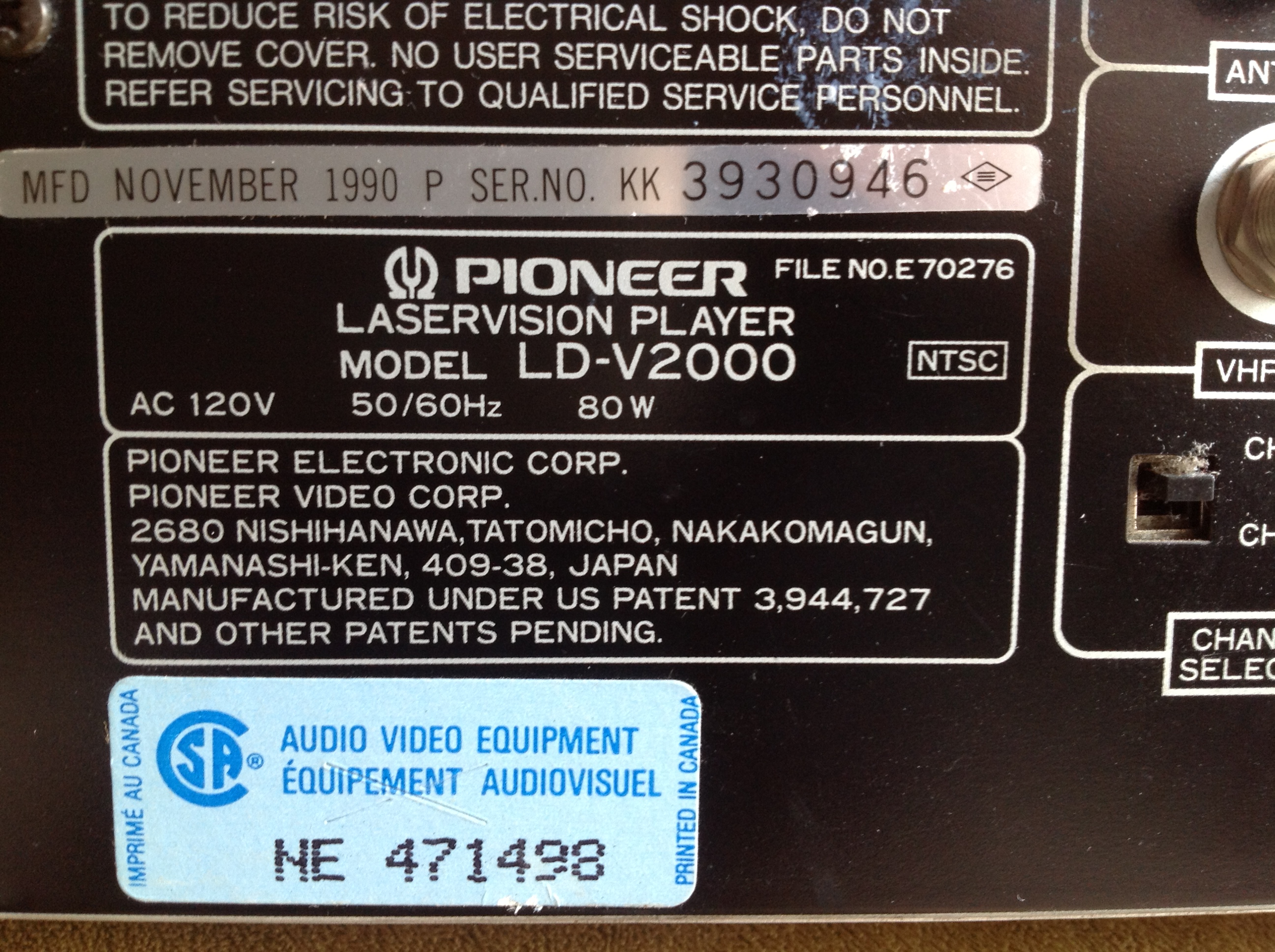 This is my Pioneer LaserVision LD-V2000 LaserDisc player that I believe I found at the old State Road Goodwill some years ago.